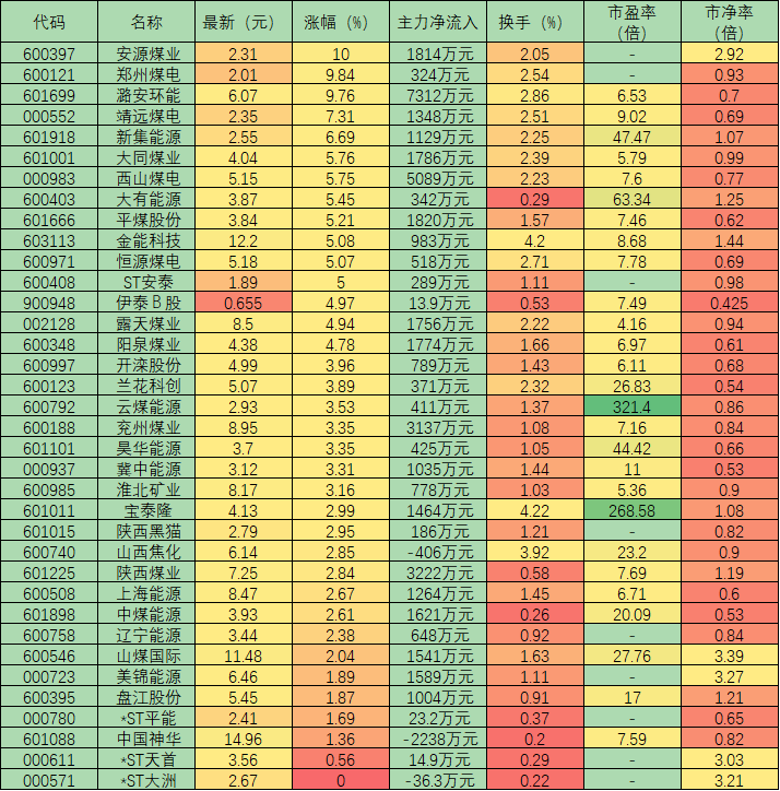 具體個(gè)股表現(xiàn)來看,煤炭采選板塊36只交易中的成份股,有35只上漲,其中,安源煤業(yè)和鄭州煤電漲停報(bào)收,另外包括潞安環(huán)能(9.76%)、靖遠(yuǎn)煤電(7.31%)、新集能源(6.69%)等在內(nèi)的11只個(gè)股漲幅均超過5%。