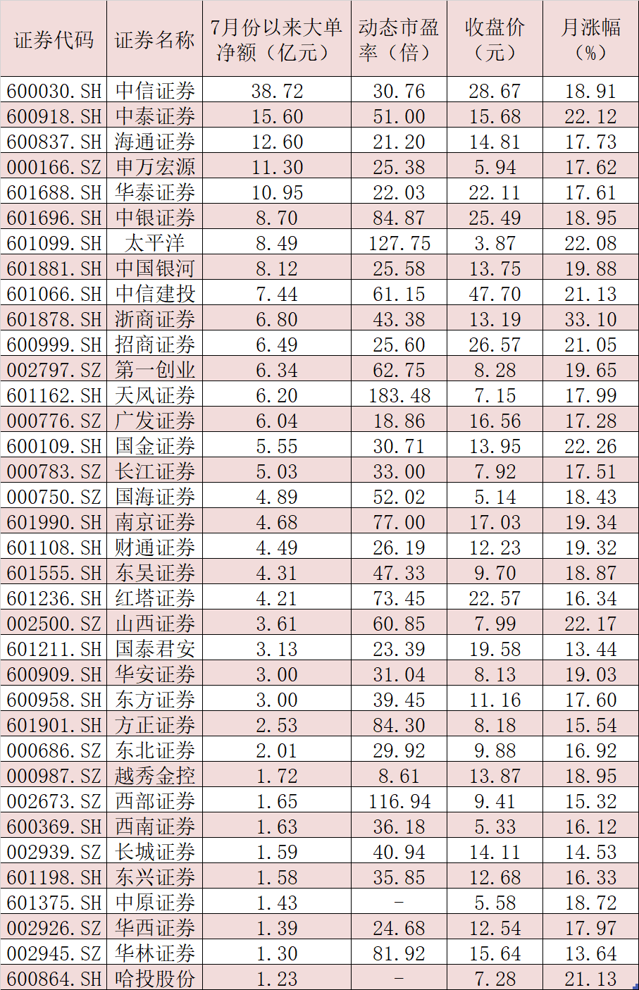 表:月內(nèi)實(shí)現(xiàn)大單資金凈流入超過1億元的券商股