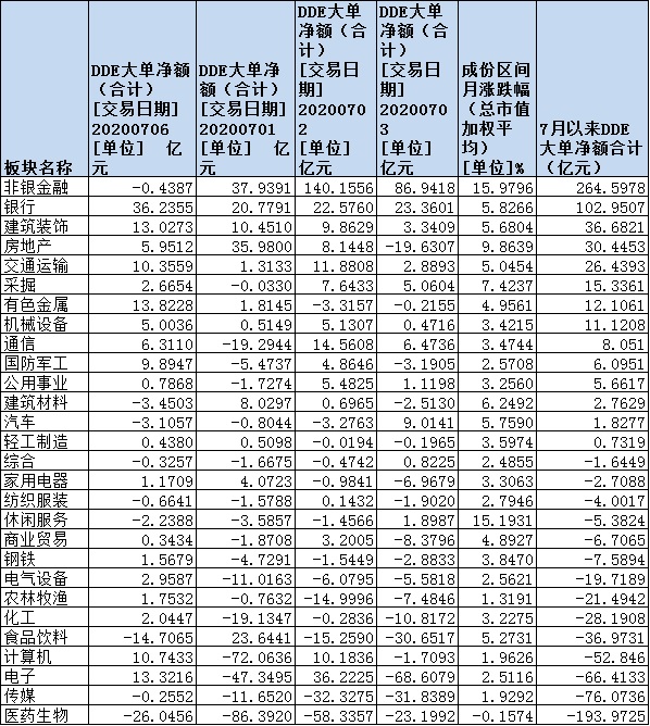 各路資金展開了調(diào)倉換股。7月以來的4個(gè)交易日中,市場呈現(xiàn)出資金凈流入態(tài)勢。從申萬一級行業(yè)來看,非銀金融和銀行等兩行業(yè)期間資金凈流入均超百億元,分別為264.6億元和102.9億元,合計(jì)達(dá)367.5億元,成為資金追捧的重點(diǎn)領(lǐng)域。而此前漲幅居前的醫(yī)藥生物行業(yè)期間累計(jì)資金凈流出達(dá)193.9億元。