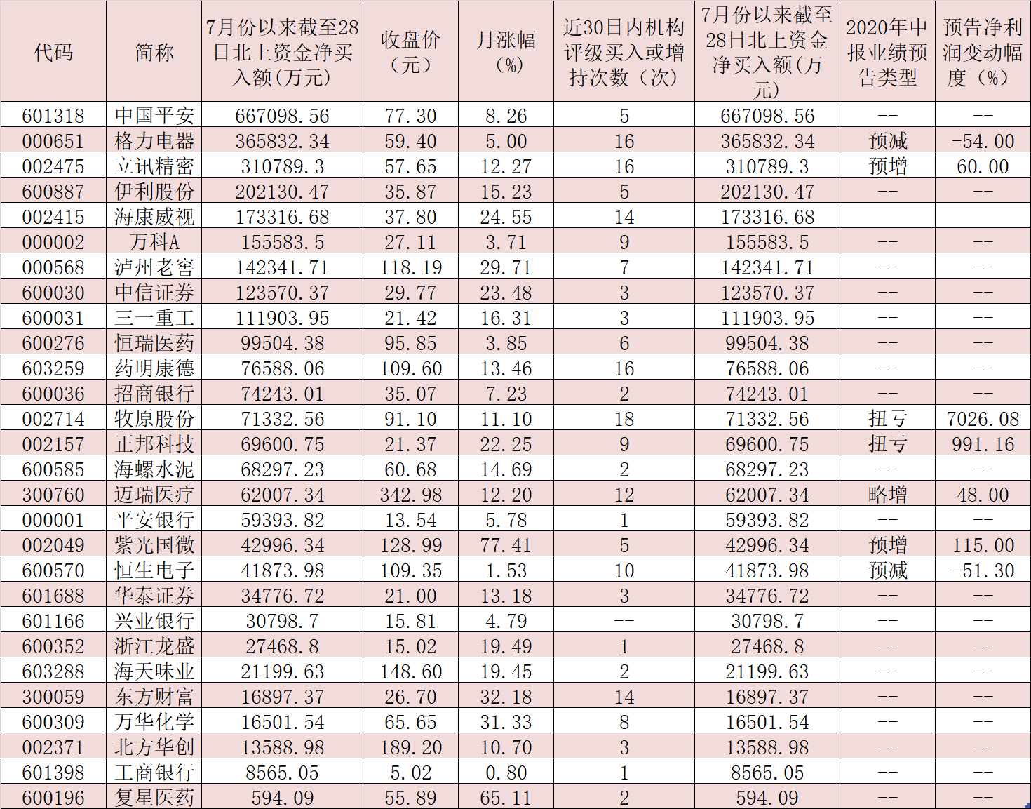 表:7月份以來截至28日獲北上資金青睞的MSCI標(biāo)的股一覽