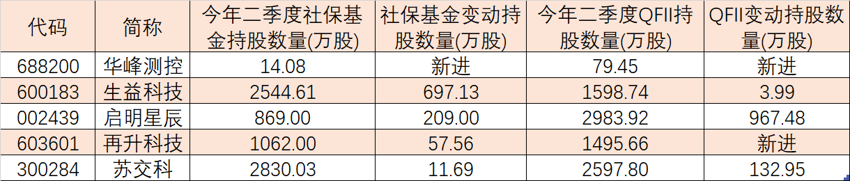 進(jìn)一步統(tǒng)計(jì)發(fā)現(xiàn),有5家公司股票成為今年二季度社?;鹋cQFII共同新進(jìn)增持的重點(diǎn)品種,上述兩類機(jī)構(gòu)投資風(fēng)格更偏向科技類龍頭股以及行業(yè)景氣度較高的績(jī)優(yōu)品種,增持資金達(dá)到11.82億元。具體來(lái)看,今年二季度社保基金以及QFII同時(shí)新進(jìn)持有華峰測(cè)控93.53萬(wàn)股,再升科技、啟明星辰、生益科技、蘇交科等4只個(gè)股今年二季度受上述兩類機(jī)構(gòu)繼續(xù)增持操作,增持?jǐn)?shù)量分別為1553.21萬(wàn)股、1176.49萬(wàn)股、701.12萬(wàn)股和144.64萬(wàn)股。