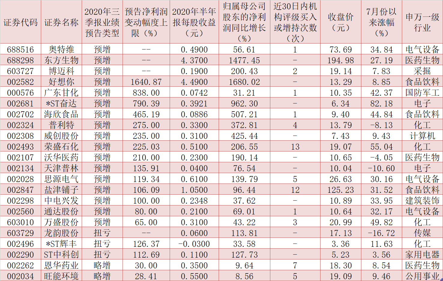 可以看到,好想你、*ST奮達(dá)、海欣食品、威創(chuàng)股份、普利特、榮盛石化、沃華醫(yī)藥、思源電氣等8家公司有望實(shí)現(xiàn)上半年和三季度凈利潤同比翻番,高成長性較為顯著。