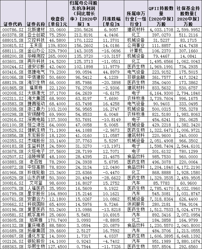 秉承長期投資、價值投資理念的社?;鸪謧}一直以來備受各方關(guān)注。在上述1110家凈利潤增長的公司中,截至今年上半年,包括順絡(luò)電子、湯臣倍健、利爾化學(xué)、廈門象嶼等在內(nèi)的197家公司的前十大流通股股東名單中有社?;瓞F(xiàn)身。另外,有106公司的前十大流通股股東名單中有QFII現(xiàn)身。進一步梳理發(fā)現(xiàn),有43家公司同時被社?;鸷蚎FII持有,成為兩大機構(gòu)共同追捧的對象。