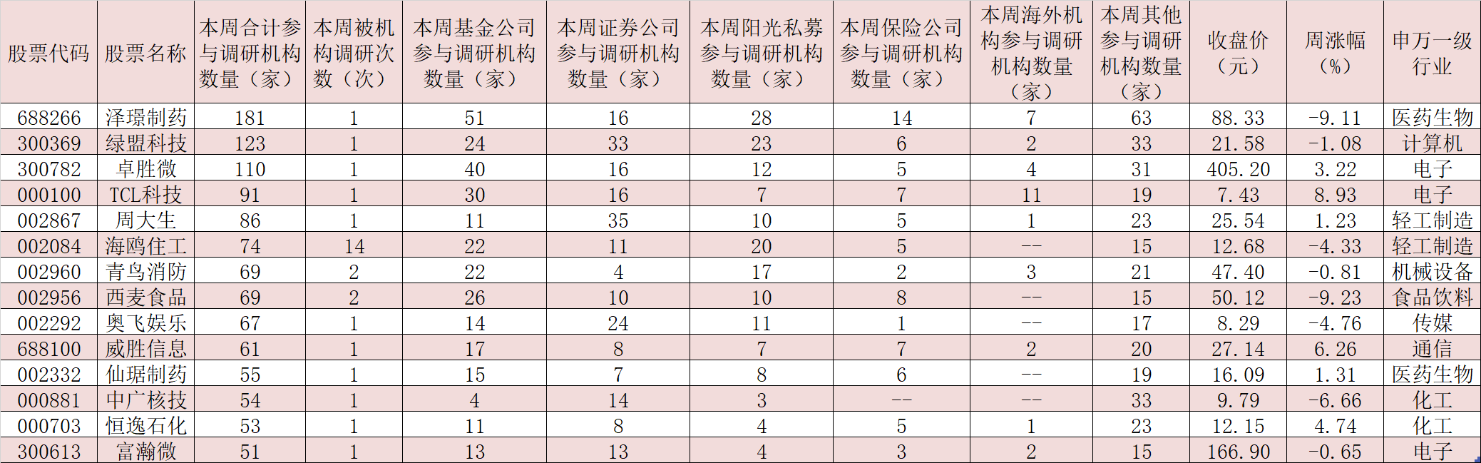 表:本周機(jī)構(gòu)調(diào)研數(shù)量超過(guò)50家的公司
