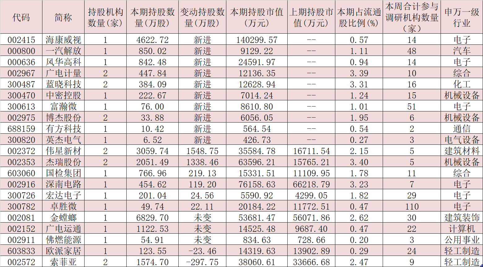 可以看到,以QFII為代表的外資也提前布局了近期機(jī)構(gòu)調(diào)研標(biāo)的。統(tǒng)計(jì)顯示,上述189只個(gè)股中,截至今年二季度末,共有21只個(gè)股獲得QFII持倉(cāng),合計(jì)持股市值為31.94億元。其中,16只個(gè)股成為今年二季度QFII新進(jìn)增持的重點(diǎn)品種,QFII新進(jìn)持有??低?、一汽解放、風(fēng)華高科、廣電計(jì)量、藍(lán)曉科技、中密控股、富瀚微、博杰股份、有方科技、英杰電氣等10只個(gè)股,并對(duì)偉星新材、杰瑞股份、國(guó)檢集團(tuán)、深南電路、宏達(dá)電子、卓勝微等6只個(gè)股進(jìn)行繼續(xù)加倉(cāng)操作,這16只個(gè)股QFII合計(jì)增持資金達(dá)31.49億元。