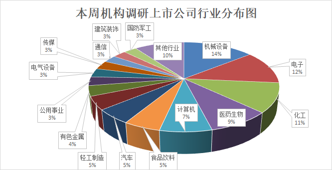 從行業(yè)角度來(lái)看,上述本周獲得機(jī)構(gòu)調(diào)研的189只個(gè)股主要扎堆在機(jī)械設(shè)備、電子、化工、醫(yī)藥生物、計(jì)算機(jī)、食品飲料、汽車等七行業(yè),涉及個(gè)股數(shù)量分別為27只、23只、20只、17只、14只、10只和10只。綜合來(lái)看,以電子、計(jì)算機(jī)為代表的科技龍頭公司以及醫(yī)藥生物、食品飲料等代表的消費(fèi)類龍頭公司仍然是本周機(jī)構(gòu)調(diào)研的重點(diǎn)。