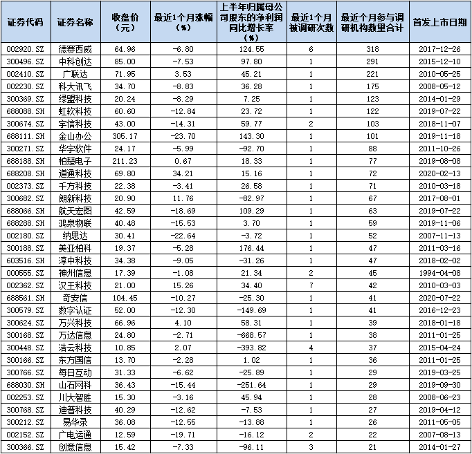 表:最近1個參與調(diào)研機構(gòu)在20家以上的計算機公司一覽