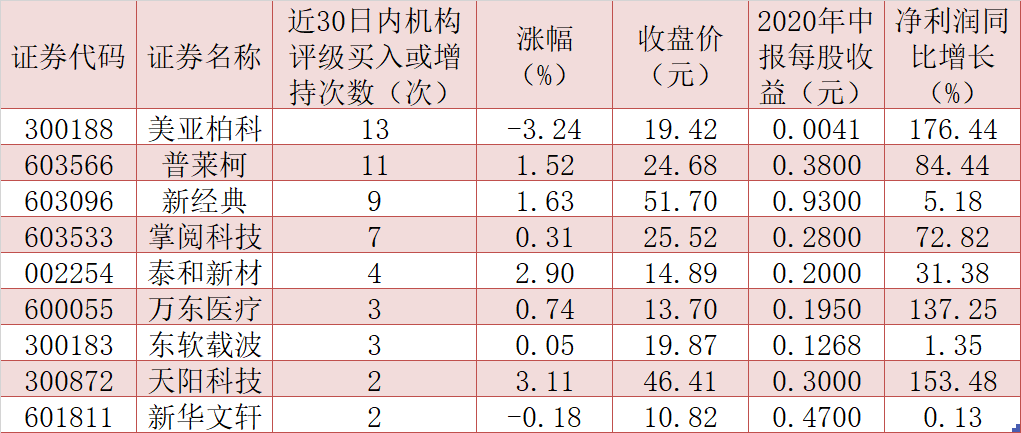值得一提的是,上述上半年業(yè)績實現(xiàn)同比增長的24家公司后市機(jī)會獲得機(jī)構(gòu)的高度關(guān)注,美亞柏科、普萊柯、新經(jīng)典、掌閱科技、泰和新材、萬東醫(yī)療、東軟載波、天陽科技和新華文軒等9只業(yè)績增長股近30日內(nèi)被機(jī)構(gòu)推薦,后市配置機(jī)會優(yōu)勢顯著。