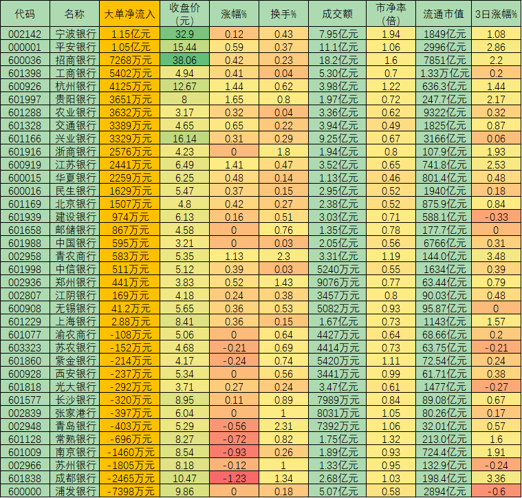 具體來(lái)看,36只交易的銀行股中,有23只呈大單資金凈流入,占比63.89%,其中,包括寧波銀行(1.15億元)、平安銀行(1.05億元)、招商銀行(7268萬(wàn)元)等在內(nèi)的14只個(gè)股凈流入額均超1000萬(wàn)元,合計(jì)凈流入6.32億元。