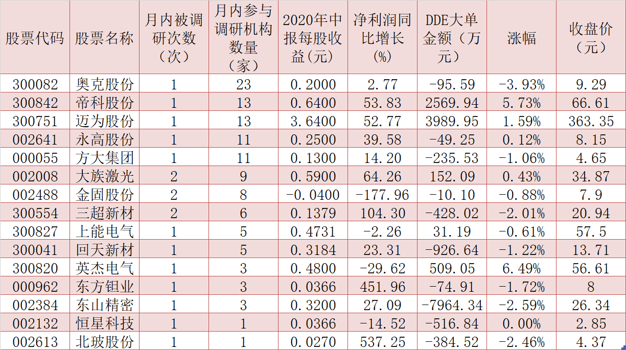 在業(yè)績(jī)逐步改善的環(huán)境下,近期機(jī)構(gòu)對(duì)光伏公司調(diào)研熱情高漲,9月份以來共有15家相關(guān)上市公司獲機(jī)構(gòu)密集調(diào)研,奧克股份、帝科股份、邁為股份、永高股份、方大集團(tuán)等5家公司月內(nèi)均受到10家及以上機(jī)構(gòu)扎堆調(diào)研,包括大族激光、金固股份、三超新材等在內(nèi)的10家公司也被機(jī)構(gòu)走訪調(diào)研。