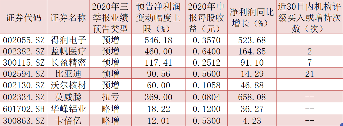 今年三季報業(yè)績預(yù)告方面,截至目前,有21家相關(guān)上市公司率先披露了2020年三季報業(yè)績預(yù)告,得潤電子、藍帆醫(yī)療、長盈精密、比亞迪、沃爾核材、英威騰、華峰鋁業(yè)、卡倍億等8家公司2020年前三季度凈利潤均有望同比增長。