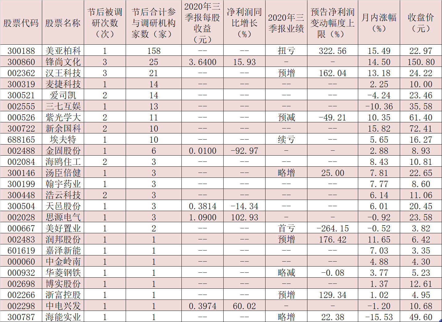 良好的業(yè)績預期或是節(jié)后機構頻繁調研的重要動力。在上述節(jié)后被機構調研的25家公司中,截至目前,已有5家公司披露了2020年三季報業(yè)績,思源電氣、中電興發(fā)、鋒尚文化等3家公司2020年前三季度凈利潤均實現同比增長,分別達到102.93%、60.02%、15.93%。