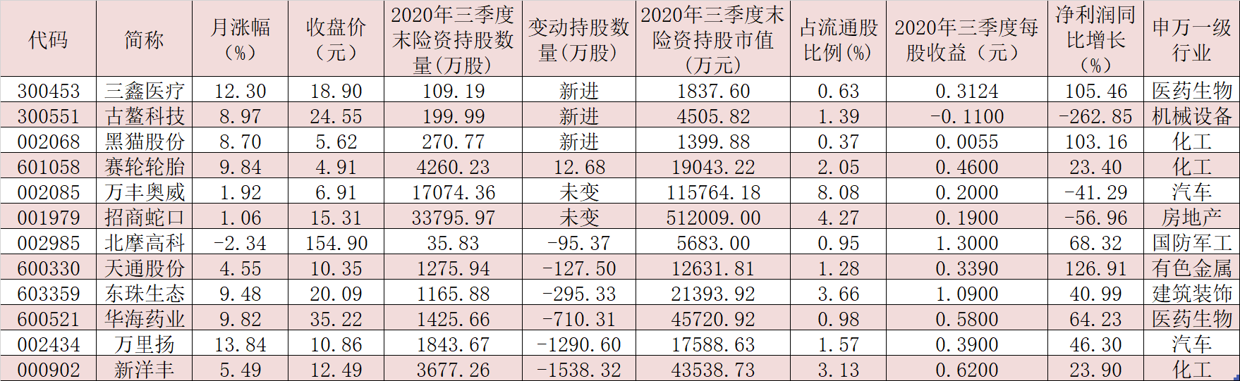 表:今年三季度獲險資持倉的個股一覽