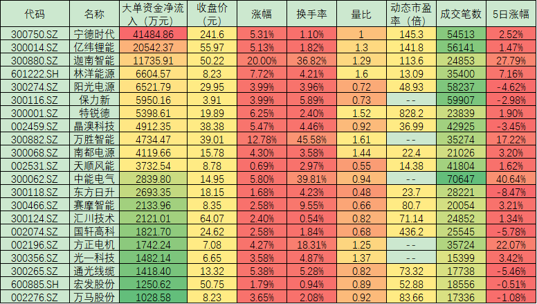 正如分析人士所言,景氣度和業(yè)績(jī)帶來了投資熱度和市場(chǎng)風(fēng)口,同時(shí),市場(chǎng)資金也開始積極布局,其中,寧德時(shí)代(41484.86萬元)、億緯鋰能(20542.37萬元)、迦南智能(11735.91萬元)等3只個(gè)股大單凈流入均超1億元,另有包括林洋能源、陽光電源、保力新等在內(nèi)的18只個(gè)股大單凈流入額均超1000萬元,以上21只個(gè)股合計(jì)大單凈流入13.43億元。
