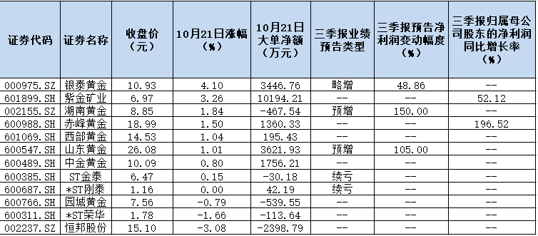 提及業(yè)績,數(shù)據(jù)顯示,截至10月21日收盤,共有7家公司已披露三季報業(yè)績或業(yè)績預(yù)告,其中,實現(xiàn)或有望實現(xiàn)前三季度凈利潤同比增長的公司達(dá)到5家,占比71.43%。赤峰黃金前三季度凈利潤同比翻番,達(dá)到196.52%,山東黃金和湖南黃金等兩家公司也均有望實現(xiàn)報告期內(nèi)凈利潤同比翻番。