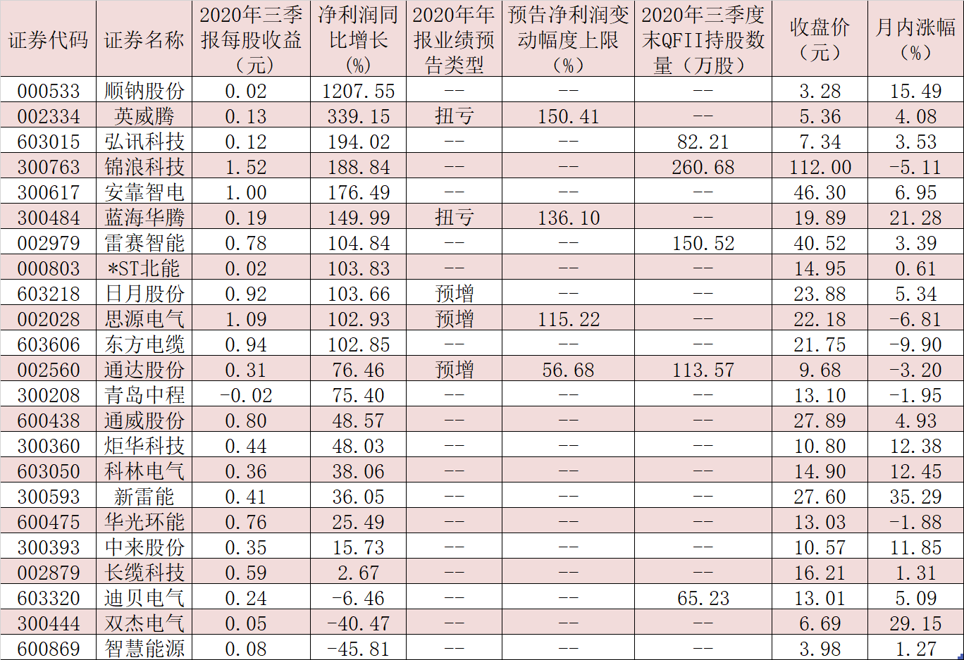 表:已披露2020年三季報(bào)業(yè)績的電氣設(shè)備公司一覽(截至10月23日)