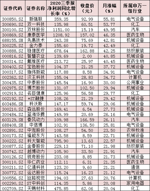 表:月內(nèi)累計(jì)漲幅超20%的三季報(bào)業(yè)績翻番股情況: