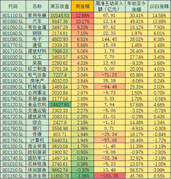 行業(yè)指數(shù)方面,上周有26類申萬一級行業(yè)上漲,占比92.86%,家用電器以12.86%的周漲幅居首,汽車和有色金屬分別以10.17%和9.23%位居第二位和第三位;下跌的兩類行業(yè)分別為醫(yī)藥生物(-1.36%)、休閑服務(wù)(-0.30%)。