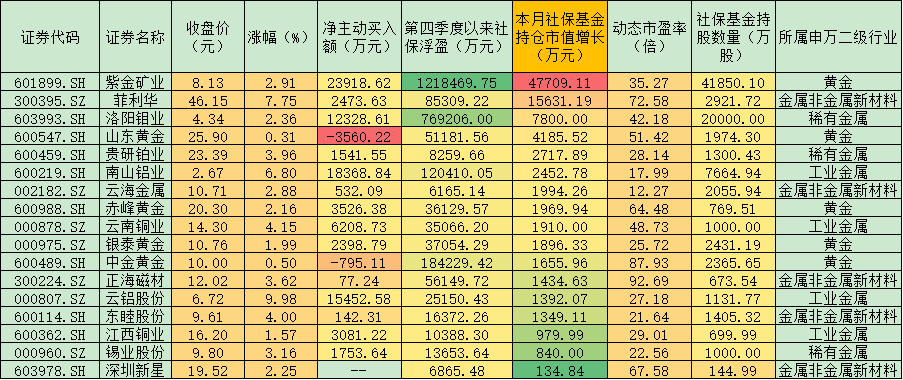 表:周一社保基金持倉(cāng)的有色金屬股市場(chǎng)表現(xiàn)一覽