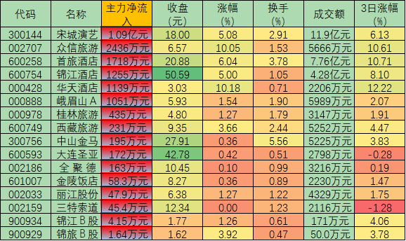 表:周二大單凈流入旅游酒店股市場表現(xiàn)一覽
