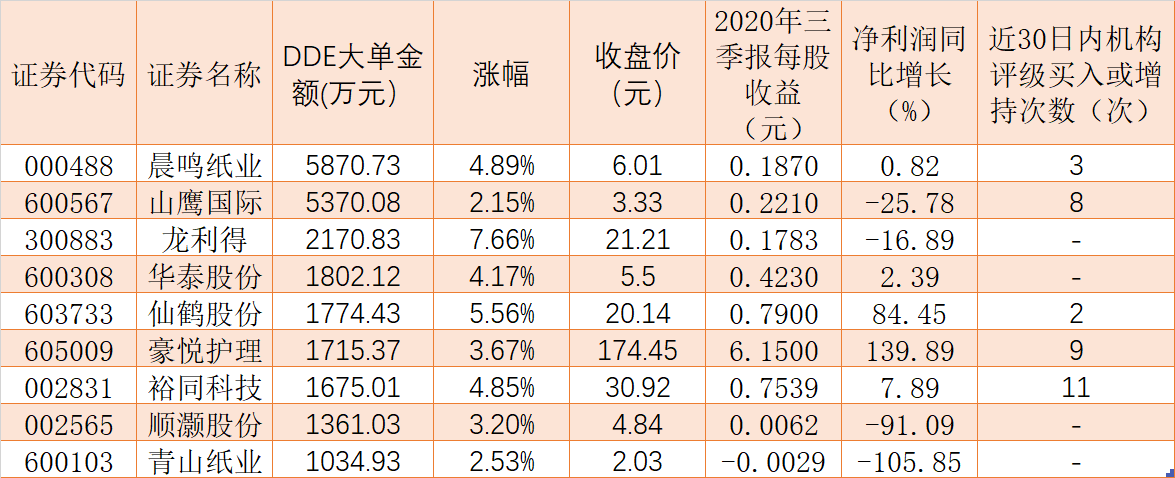 表:本周一大單資金凈流入超過(guò)千萬(wàn)元的造紙股