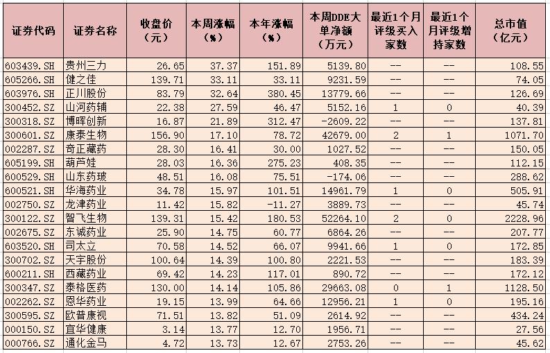 表:本周累計漲幅超13%生物醫(yī)藥行業(yè)個股一覽