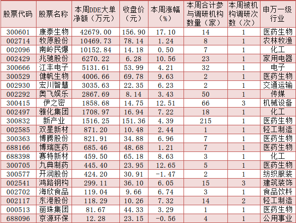 表:本周獲大單資金凈流入的機(jī)構(gòu)調(diào)研股一覽