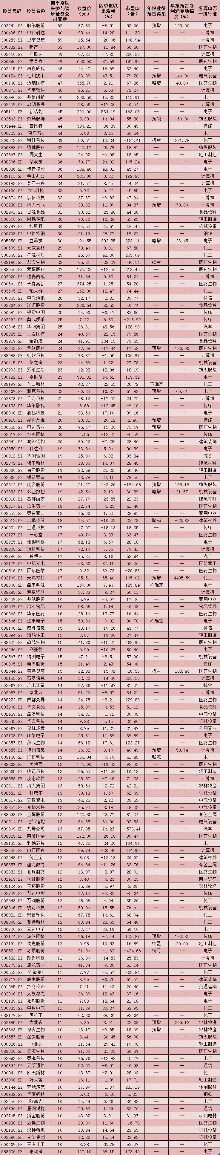 表:四季度以來參與調(diào)研的券商家數(shù)在10家及以上個股一覽
