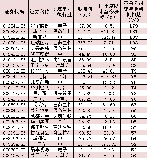 表:四季度以來參與調(diào)研的基金公司家數(shù)在50家及以上個(gè)股一覽