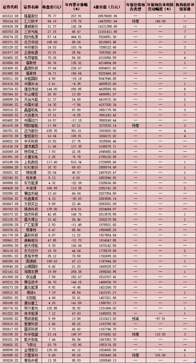 從總市值來看,經(jīng)過持續(xù)上漲后,截至12月14日收盤,67只光伏概念股最新總市值超100億元,隆基股份、匯川技術(shù)、通威股份、三安光電等4只個股最新總市值更是超過1000億元,分別為2857.87億元、1447.84億元、1412.14億元、1216.14億元。