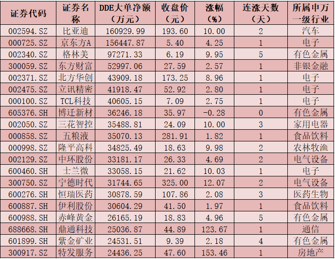 一、周一(12月21日)DDE大單資金凈買入TOP20