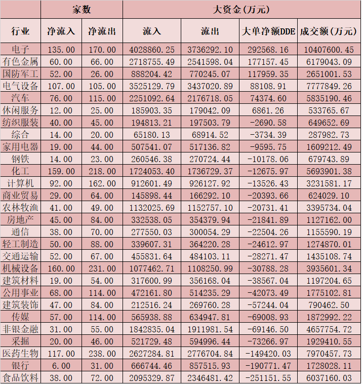 從資金層面看,今日A股大單資金整體凈流出40.58億元,其中,有1582只個股凈流入,2466只個股凈流出。從申萬一級的28個行業(yè)來看,有6個行業(yè)呈現(xiàn)大單資金凈流入態(tài)勢,其中,電子行業(yè)資金凈流入居首,達29.26億元,緊隨其后的是有色金屬、國防軍工等兩行業(yè),資金凈流入均超11億元。另外,食品飲料、銀行、醫(yī)藥生物等三行業(yè)資金凈流出均超14億元。