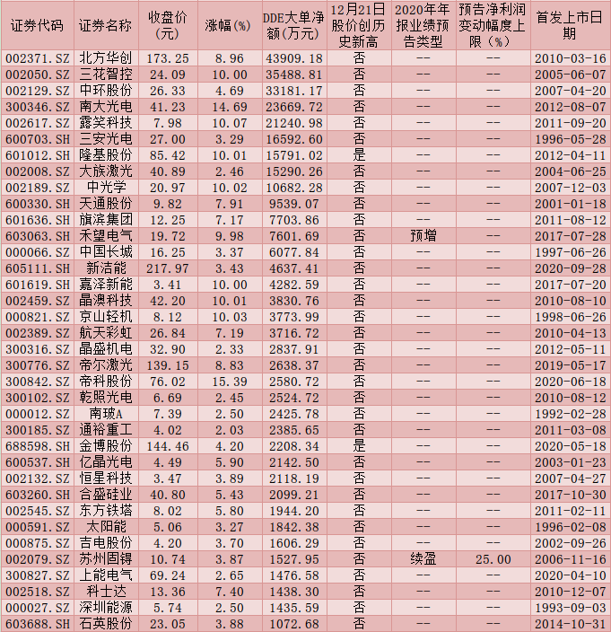 表:12月21日獲超1000萬元大單資金布局的光伏概念股