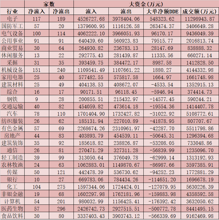 二、周三(12月23日)申萬(wàn)一級(jí)行業(yè)大單資金流向