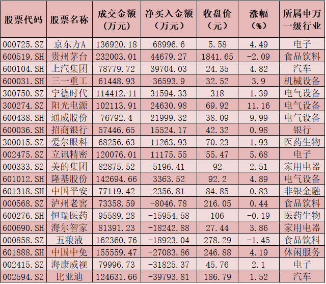 四、周三(12月23日)滬、深股通前十大成交活躍股交易情況