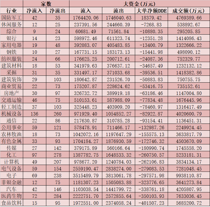 從資金層面看,今日A股大單資金整體凈流出379.51億元,其中,有1041只個股凈流入,3021只個股凈流出。從申萬一級的28個行業(yè)來看,僅國防軍工行業(yè)呈現(xiàn)大單資金凈流入態(tài)勢,大單資金凈流入合計達1.84億元。而在大單資金撤離的領(lǐng)域中,食品飲料、醫(yī)藥生物、汽車、非銀金融等四行業(yè)資金凈流出均超30億元。