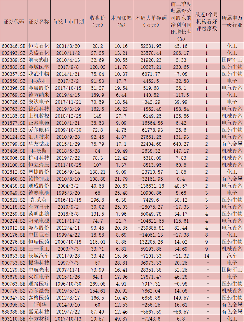 首先,績(jī)優(yōu)股占主流。上述40只強(qiáng)勢(shì)股中,有32只個(gè)股前三季度凈利潤(rùn)實(shí)現(xiàn)同比增長(zhǎng),占比80%。華友鈷業(yè)、金域醫(yī)學(xué)、榮盛石化、錦浪科技、泰格醫(yī)藥、科沃斯、匯川技術(shù)、上機(jī)數(shù)控、陽光電源等9只個(gè)股前三季度凈利潤(rùn)同比增幅超100%。