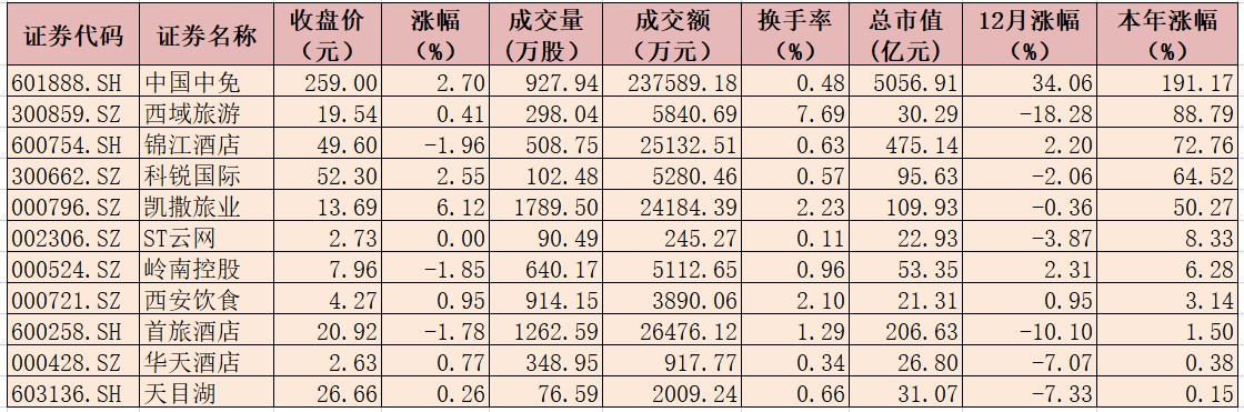 表:截至12月25日休閑服務(wù)行業(yè)年內(nèi)上漲個股一覽