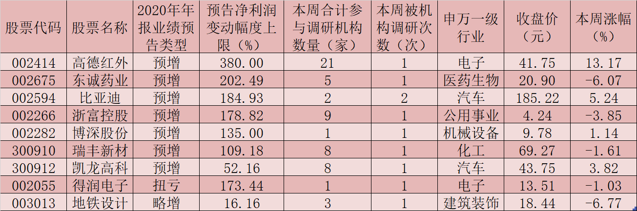 良好的年報業(yè)績預(yù)期向好或是本周機(jī)構(gòu)頻繁調(diào)研的重要動力。在上述本周被機(jī)構(gòu)調(diào)研的79家公司中,截至12月27日,已有14家公司率先披露了2020年年報業(yè)績預(yù)告,業(yè)績預(yù)喜公司共有9家,占比逾六成。高德紅外、東誠藥業(yè)、比亞迪、浙富控股、博深股份、瑞豐新材等6家公司均預(yù)計2020年全年凈利潤同比翻番。
