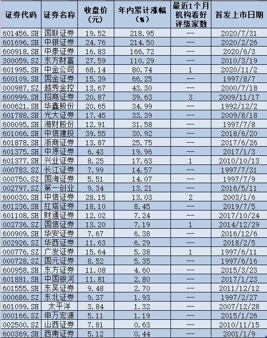 表:年內(nèi)股價(jià)實(shí)現(xiàn)上漲的券商股一覽