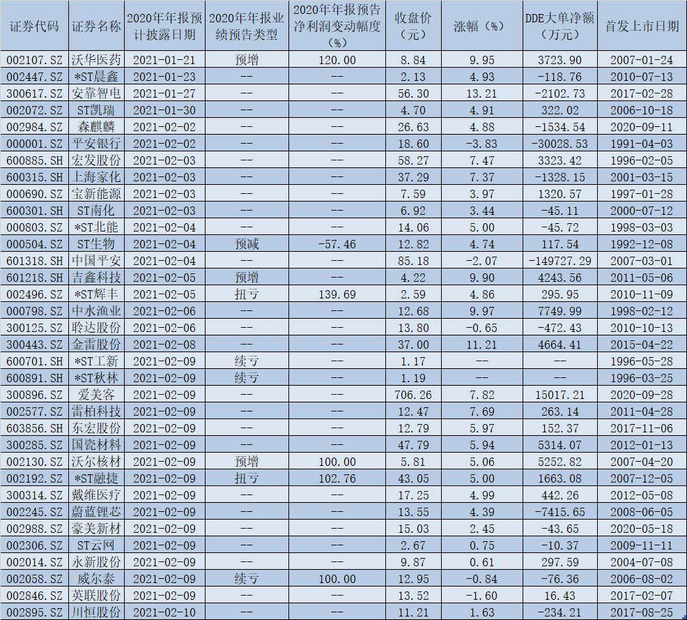 進一步梳理發(fā)現(xiàn),在34家計劃在春節(jié)長假前披露2020年年報的公司中,有9家公司已披露2020年年報業(yè)績預告,業(yè)績預喜公司家數達到5家,占比55.56%。其中,沃華醫(yī)藥、沃爾核材等兩家公司均預計2020年凈利潤同比最大增幅達到或超過100%。