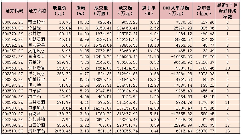 表:1月5日漲幅超3%白酒概念股一覽