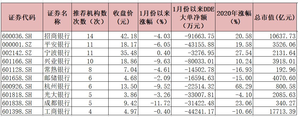 進一步梳理發(fā)現(xiàn),銀行業(yè)獲得推薦次數(shù)最多的前十大“金股”分別為招商銀行、平安銀行、寧波銀行、興業(yè)銀行、常熟銀行、杭州銀行、郵儲銀行、光大銀行、成都銀行、工商銀行。