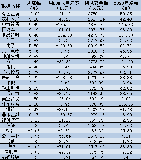 以申萬一級行業(yè)指數(shù)2021年首周漲幅排名來看,共有20個申萬一級行業(yè)指數(shù)實現(xiàn)不同程度的上漲,其中,期間累計漲幅前三名的行業(yè)分別為,有色金屬、農(nóng)林牧漁、電氣設(shè)備,這三大行業(yè)期間累計漲幅均在9%以上。而紡織服裝則成為新年首周跌幅最大的行業(yè),期間累計跌幅達到3.53%,此外,房地產(chǎn)、計算機和通信等行業(yè)期間累計跌幅也均在1%以上。