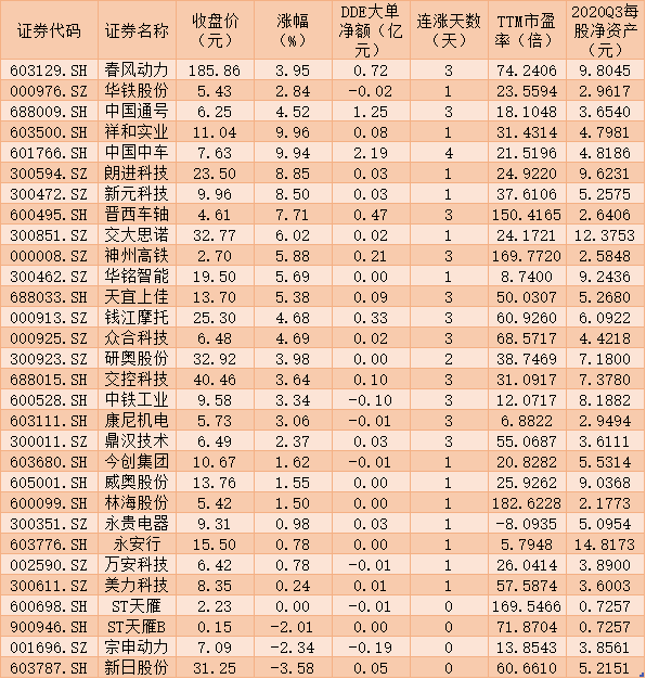 大單資金也對交運(yùn)設(shè)備股進(jìn)行了大量增倉。據(jù)《證券日報(bào)》記者通過IFIND統(tǒng)計(jì)顯示,周四交運(yùn)設(shè)備板塊有30只個(gè)股累計(jì)呈DDE大單主動(dòng)凈流入態(tài)勢,合計(jì)凈流入5.31億元,其中,中國中車(2.19億元)、中國通號(hào)(1.25億元)、春風(fēng)動(dòng)力(0.72億元)、晉西車軸(0.47億元)、錢江摩托(0.33億元)、神州高鐵(0.21億元)、交控科技(0.10億元)等7只個(gè)股DDE大單凈買入額均超1000萬元,合計(jì)5.27億元。