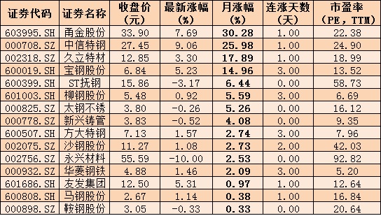 《證券日報》記者根據(jù)同花順數(shù)據(jù)統(tǒng)計后發(fā)現(xiàn),今年以來截至1月14日,鋼鐵行業(yè)指數(shù)累計漲幅漲幅達4.63%,悄然跑贏同期上證指數(shù)2.67%的漲幅。其中,甬金股份、中信特鋼、久立特材、寶鋼股份等4只鋼鐵股,期間累計漲幅均超10%,分別為30.28%、25.98%、17.89%和14.96%,盡顯強勢。