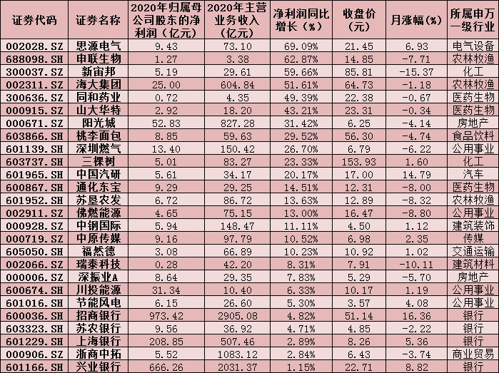 凈利潤方面,公布業(yè)績快報的31家公司去年全部實現(xiàn)盈利。其中,凈利潤超1億元的公司達(dá)27家。值得關(guān)注的是,有3家公司凈利潤在100億元以上的。凈利潤最高的是招商銀行,2020年實現(xiàn)凈利潤973.42億元,其次是興業(yè)銀行和上海銀行,凈利潤分別為666.26億元、208.85億元。另外,上港集團、陽光城、川投能源、海大集團、深圳燃?xì)獾?家公司,凈利潤均超10億元。