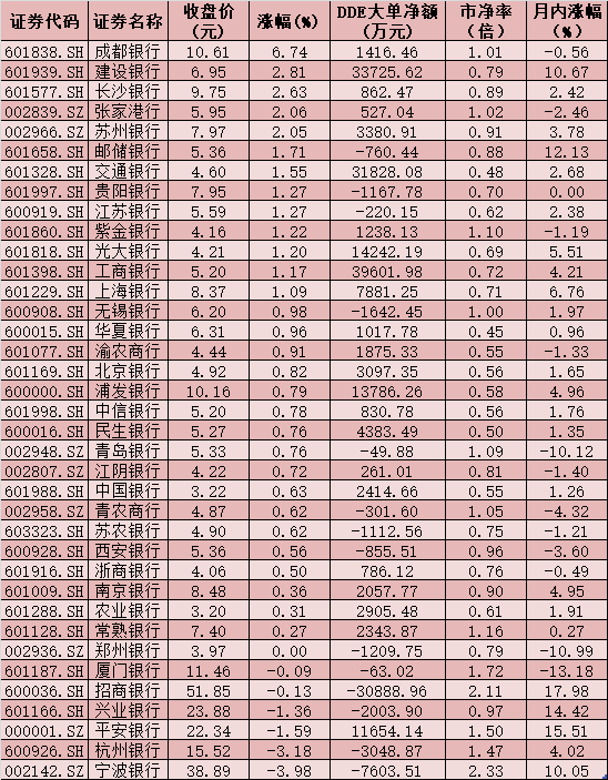 可以看到,今年以來,共有24只銀行股實現(xiàn)上漲,占行業(yè)成份股家數(shù)比例超過六成,其中,招商銀行、平安銀行、興業(yè)銀行、郵儲銀行、建設(shè)銀行、寧波銀行等6只個股期間累計漲幅均在10%以上。
