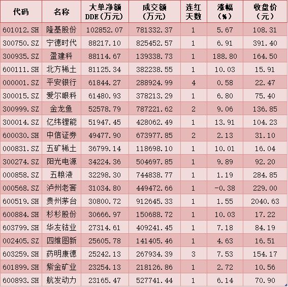 一、周三(1月20日)DDE大單資金凈買入TOP20