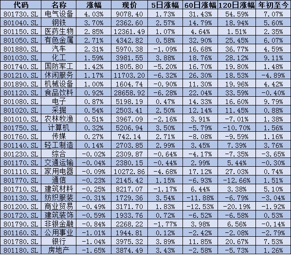 從行業(yè)來(lái)看,周三,申萬(wàn)一級(jí)28個(gè)行業(yè)中有16個(gè)行業(yè)指數(shù)飄紅。其中,電氣設(shè)備行業(yè)表現(xiàn)強(qiáng)勢(shì),漲幅居首,達(dá)4.03%;緊隨其后的是鋼鐵、醫(yī)藥生物、有色金屬、汽車等四行業(yè),漲幅均超2%,分別為3.7%、2.85%、2.71%和2.31%;房地產(chǎn)、銀行和公用事業(yè)等三行業(yè)跌幅均超1%。